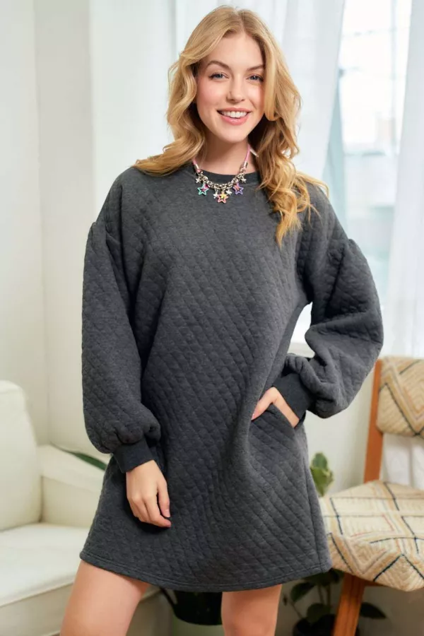 Solid Quilted Long Sleeve Oversize Dress 60% COTTON 40% POLY