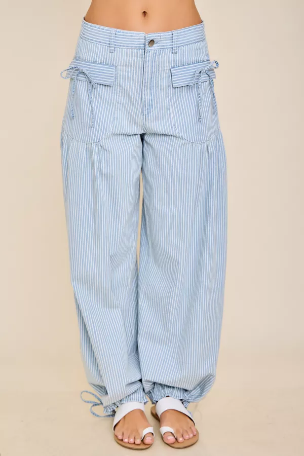 Soft striped balloon pants with a relaxed Southern charm. Features curved pockets, mini cargo flaps with cute tie details, and a gently cinched hem for that breezy boutique look. Lightweight, comfy, and perfect for spring markets, weekend outings, lake trips, and everyday Southern style. A unique, easy-to-wear bottom your customers will love.
