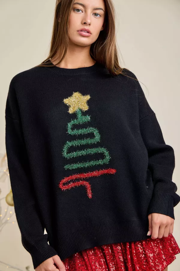 Round Neck Sparkle Christmas Tree Patch Solid Sweater 100% ACRYLIC
