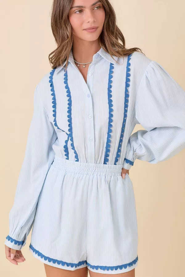 Product Details: - Long Sleeve Stripe Romper - Contrasting Scallop Lace Trim Detail - Collared Neck - Button Up - Puff Shoulder