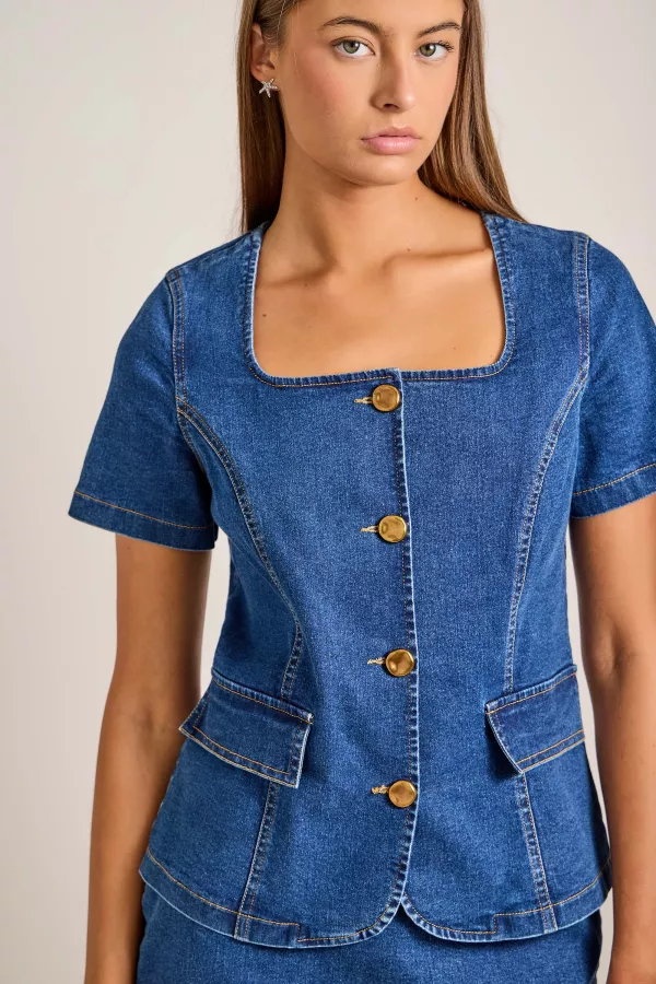 Tailored Square Neck Denim Top with Button Front 78%COTTON 10%POLYESTER 10%VISCOSE 2%SPANDEX SET-CP81178