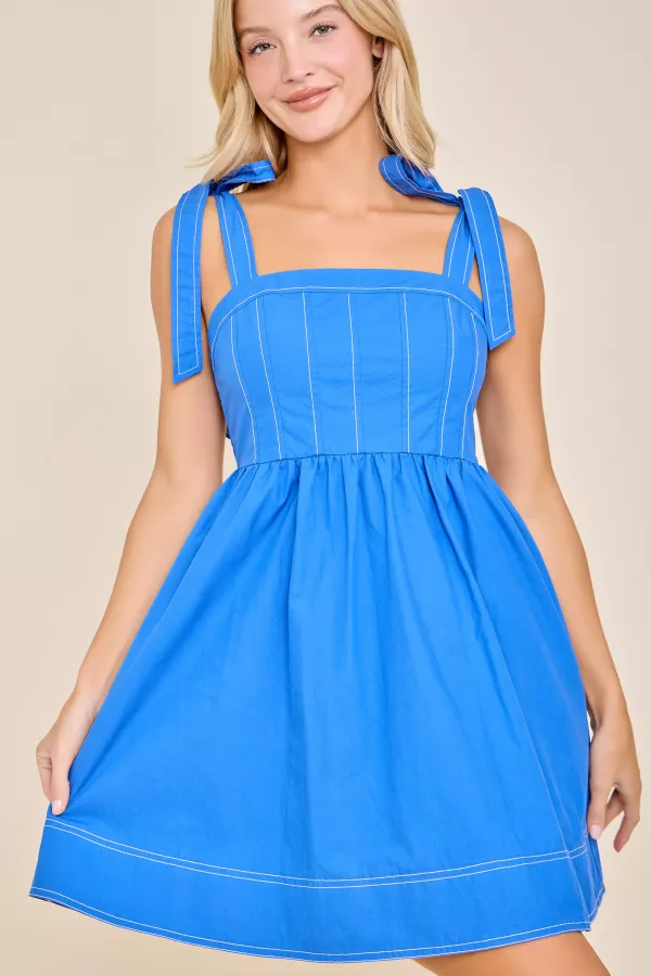 Sweet and flattering babydoll dress with tie shoulder straps and corset-style stitching. Made from crisp poplin with a flowy silhouette that moves beautifully. Perfect for spring outings, resort getaways, or game day looks when styled with sneakers or boots. Available in blue and orange. tie strap dress, babydoll dress, poplin dress, game day dress, blue dress, orange dress, southern boutique apparel, spring resort, casual chic, sleeveless dress, bow strap, corset seam, summer collection, flowy mini dress, cute gameday outfit, weekend style, resort capsule, girly look, college game day, coastal charm, boutique essential, lightweight cotton dress, feminine fit, bow detail, versatile outfit