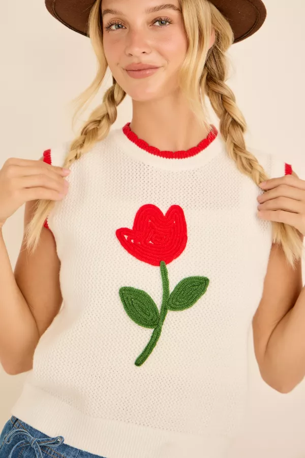 TULLIP EMBROIDERED CONTRAST SCALLOP EDGE POINTELLE KNIT SLEEVELESS TOP