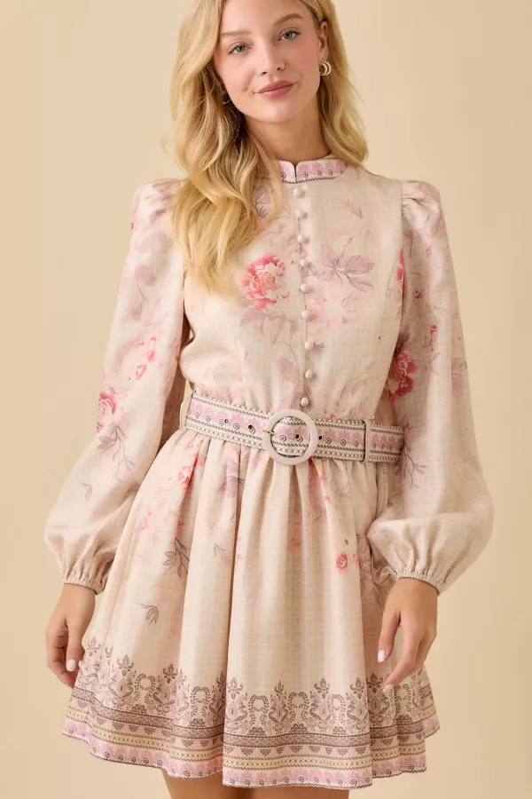 Vintage Floral Print Mock Neck Button Down Mini Long Sleeve Dress This long sleeve mini dress features a vintage-inspired floral print, a refined mock neckline, and a full button-down front for classic charm. Made from soft, lightweight fabric, it's perfect for layering with boots
