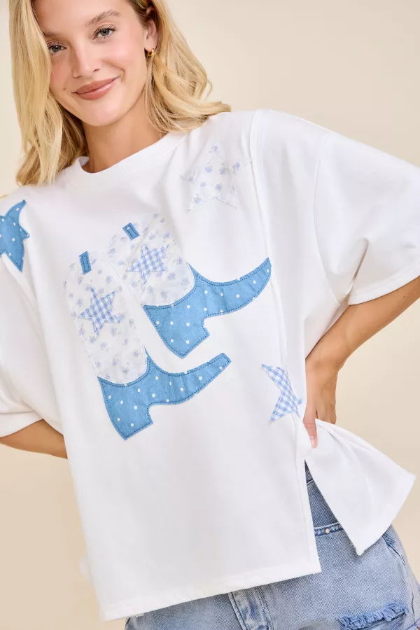 Step into western charm with this patchwork boots tee! Featuring denim star appliqués and mixed floral gingham patterns, this relaxed-fit top blends country flair with a cozy casual feel — perfect for everyday wear or line dancing nights. western tee, cowboy boots top, patchwork star shirt, country casual, rodeo outfit, line dance style 💡 Styling Tip: Pair it with denim shorts or a floral skirt for the perfect “Western Girly Casual” vibe.