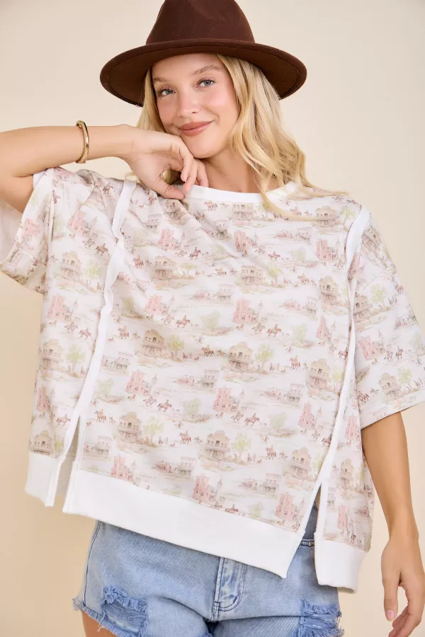 A cozy pullover top featuring a vintage western town print in soft neutral tones. Relaxed fit with dropped shoulders and ribbed trim for everyday comfort. Perfect for pairing with denim, boots, or skirts for a Southern boutique western look — effortless, nostalgic, and stylish. southern boutique apparel, western print top, cowboy town sweatshirt, vintage western pullover, neutral tone top, southern casual outfit, boutique western fashion, rustic print tee, relaxed fit pullover, fall boutique top, retro cowgirl style, cozy casual top, neutral western clothing, southern chic boutique, nostalgic print top